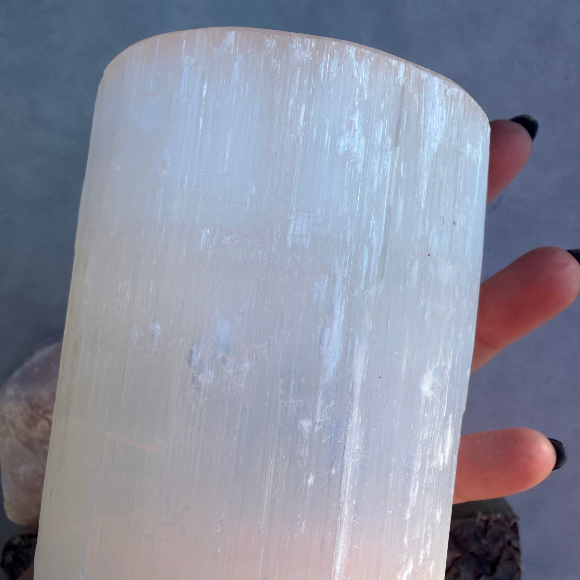 Material & Größe: reiner Selenit, ca. 10cm Höhe (Zylinderform)