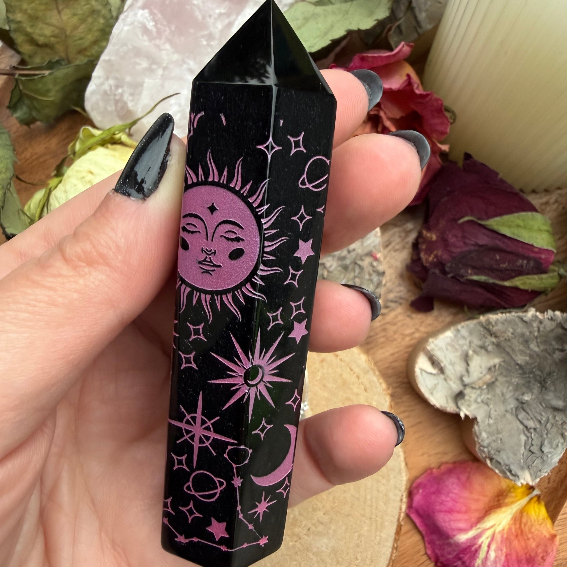 Der sanft glänzende Obsidian mit Sonne- & Mond-Gravur verbindet Stabilität mit Bewusstsein und macht jede Spitze zu einem besonderen Kraft- und Ritualobjekt.